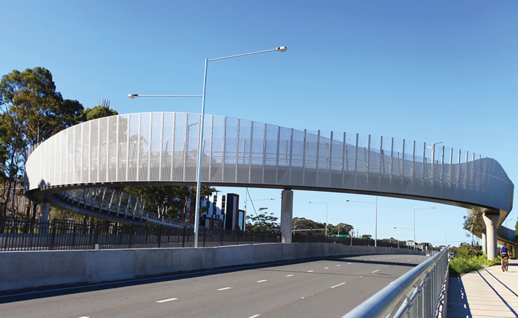 Northern Beaches Overpass | PerfArt Project Project Completion: 2019 October 1, 2020 Stoddart was engaged by Ferrovial York (now Ferrovial Agroman) to provide perforated anti-throw screens to both Hilmer and Forest Way pedestrian overpasses crossing Warringah Road in Frenches Forest in New South Wales. Both of the bridges allow for safe passage of pedestrian and cycle traffic across the busy Warringah Road. The Hilmer intersection gives direct access to the Northern Beaches Hospital. The screen panels were specified and manufactured from anodised quality aluminium plate - 5mm thick and anodised in the colour Spanish Silver. The panels were folded as a cassette type system to conceal fixings and bolted to structural steel posts. Stoddart incorporated 3D surveying and drafting techniques to ensure the panels were accurately manufactured to suit the geometry of the bridge and structural steel work. The end result was flawless. The perforated pattern was specified by the architect/designer AECOM, whom Stoddart worked closely with to ensure the design intent was achieved. The perforations graduate in hole size, providing a ‘fading’ effect along the span, with smaller holes increasing to larger holes at the midpoint of the bridges. Both bridges utilise the same perforated pattern. There is approximately 315m² of perforated panel cladding the Forest Way overpass and 255m² for Hilmer. All panels were manufactured in Stoddart’s Brisbane based factory, and carefully crated and shipped to site for installation. 1 / 4 Image 1 2 / 4 Image 2 3 / 4 Image 3 4 / 4 Image 4 ❮ ❯